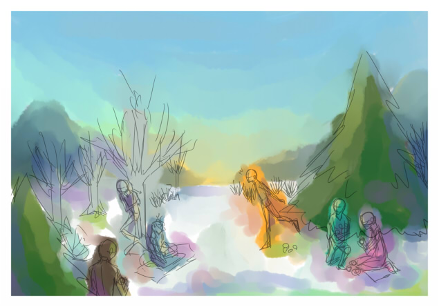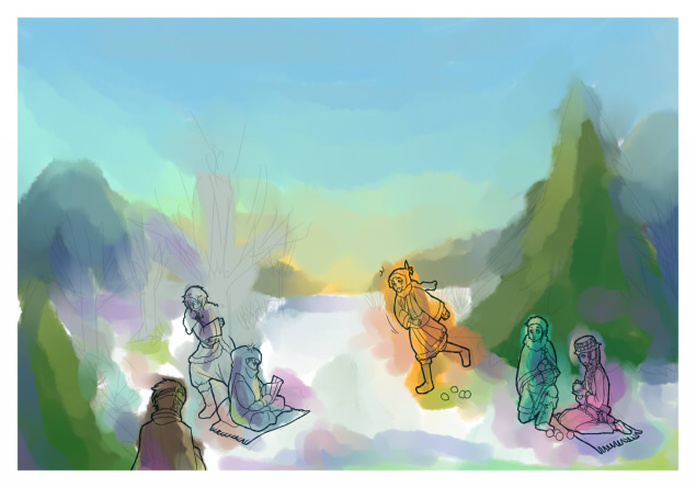 「彩筆」でざっと色をつけつつ、人物のラフと背景(近景)の配置バランスをとりました。