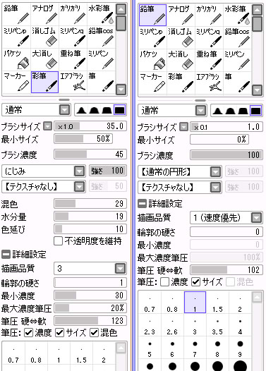 ちなみに鉛筆(右)もブラシ濃度を下げて「にじみ」をつけて細かいところ(主に背景の彩色)に使ってます。